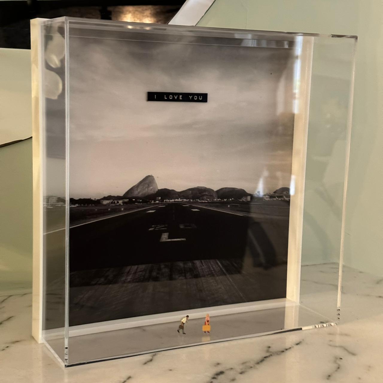 Foto aeroporto Rio de Janeiro, moldura em acrílico, um casal com malas de mão se encontrando e frase I LOVE YOU.