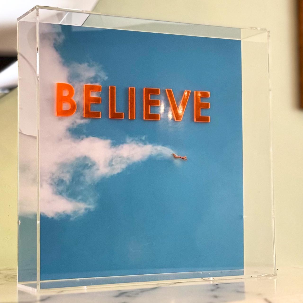 Caixa em Acrílico com foto do céu com moça mergulhando e frase: BELIEVE