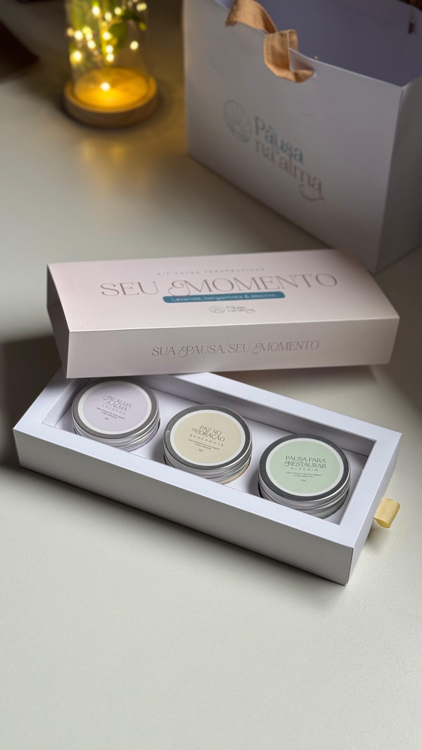Trio de Velas Caixa com 03 velas naturais, produzidas com cera vegetal, óleo essencial e pavio de algodão.