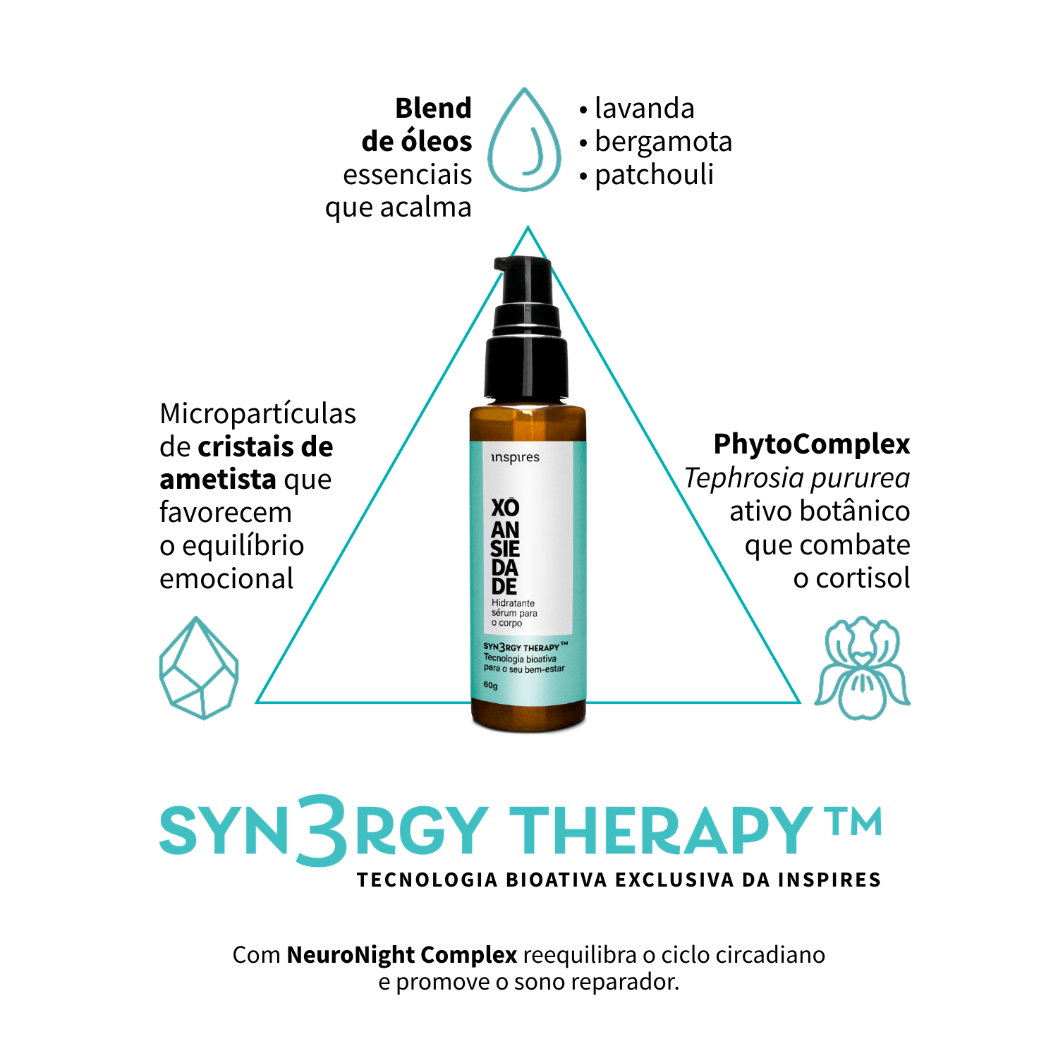 Tecnologia Syn3ergy Therapy™ com blend de óleos essenciais (lavanda + bergamota + patchouli), neuroline e cristais de ametista.