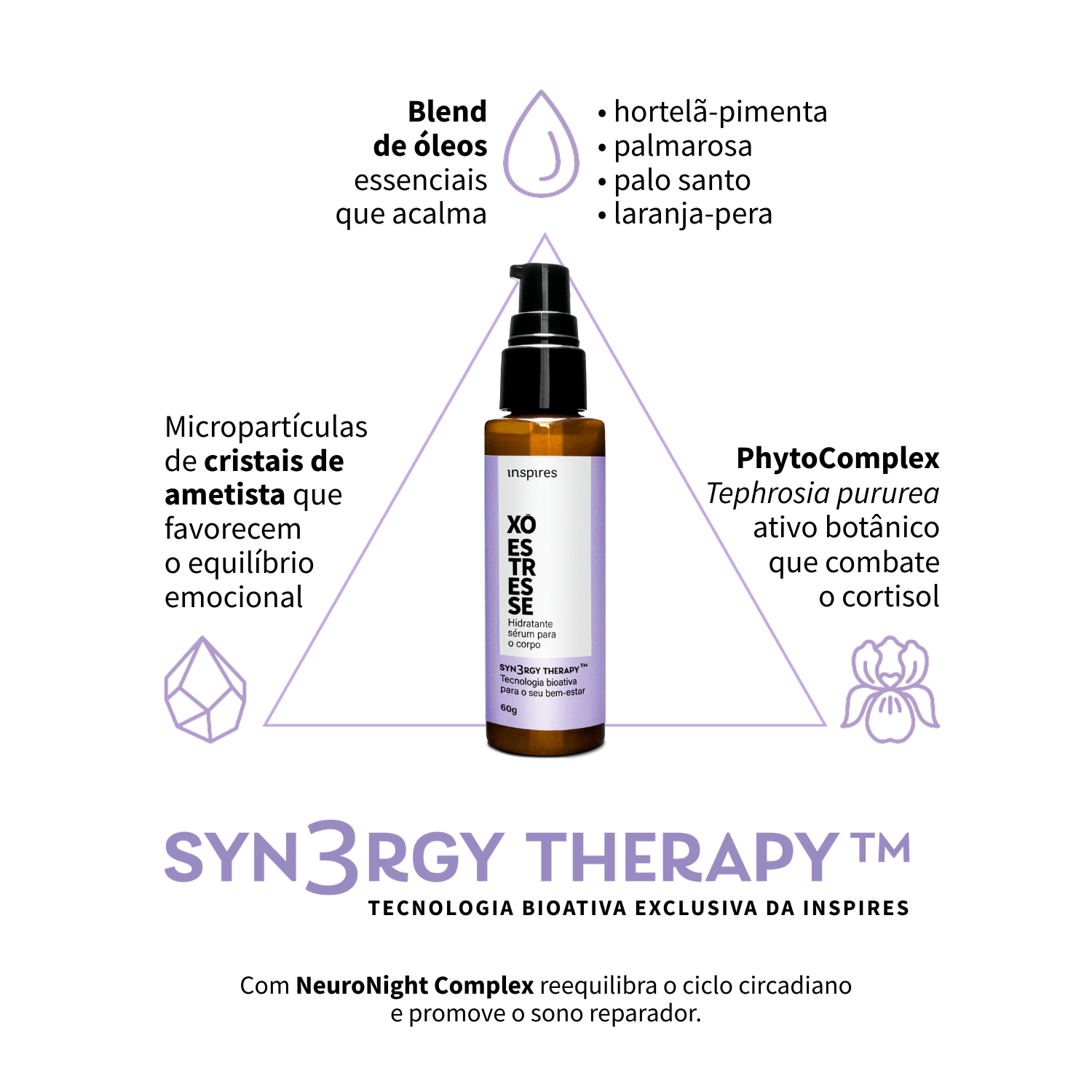 Tecnologia Syn3ergy Therapy™ com blend de óleos essenciais (hortelã pimenta + palo santo+ palmarosa+ laranja pera), Neuroline® e cristais de ametista.