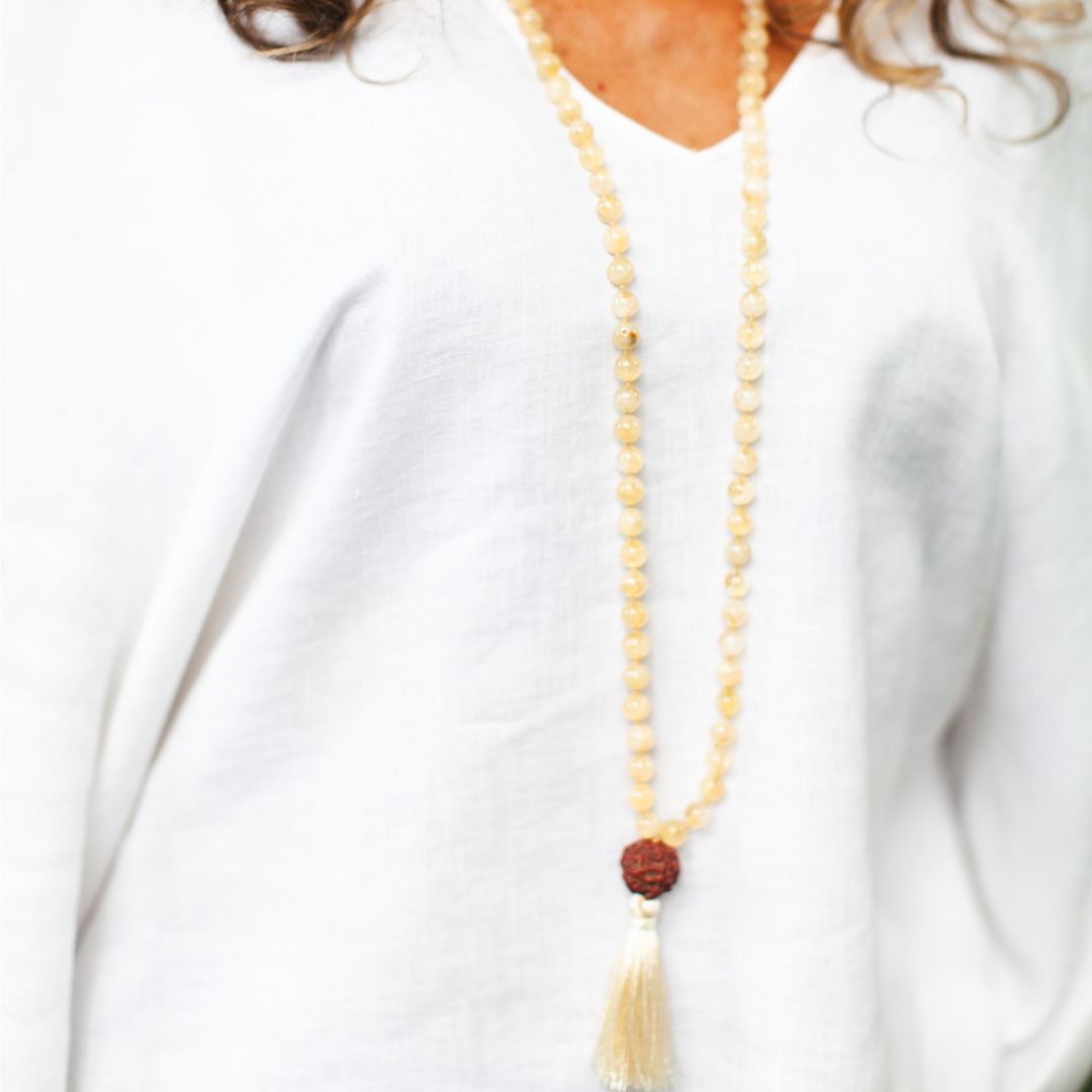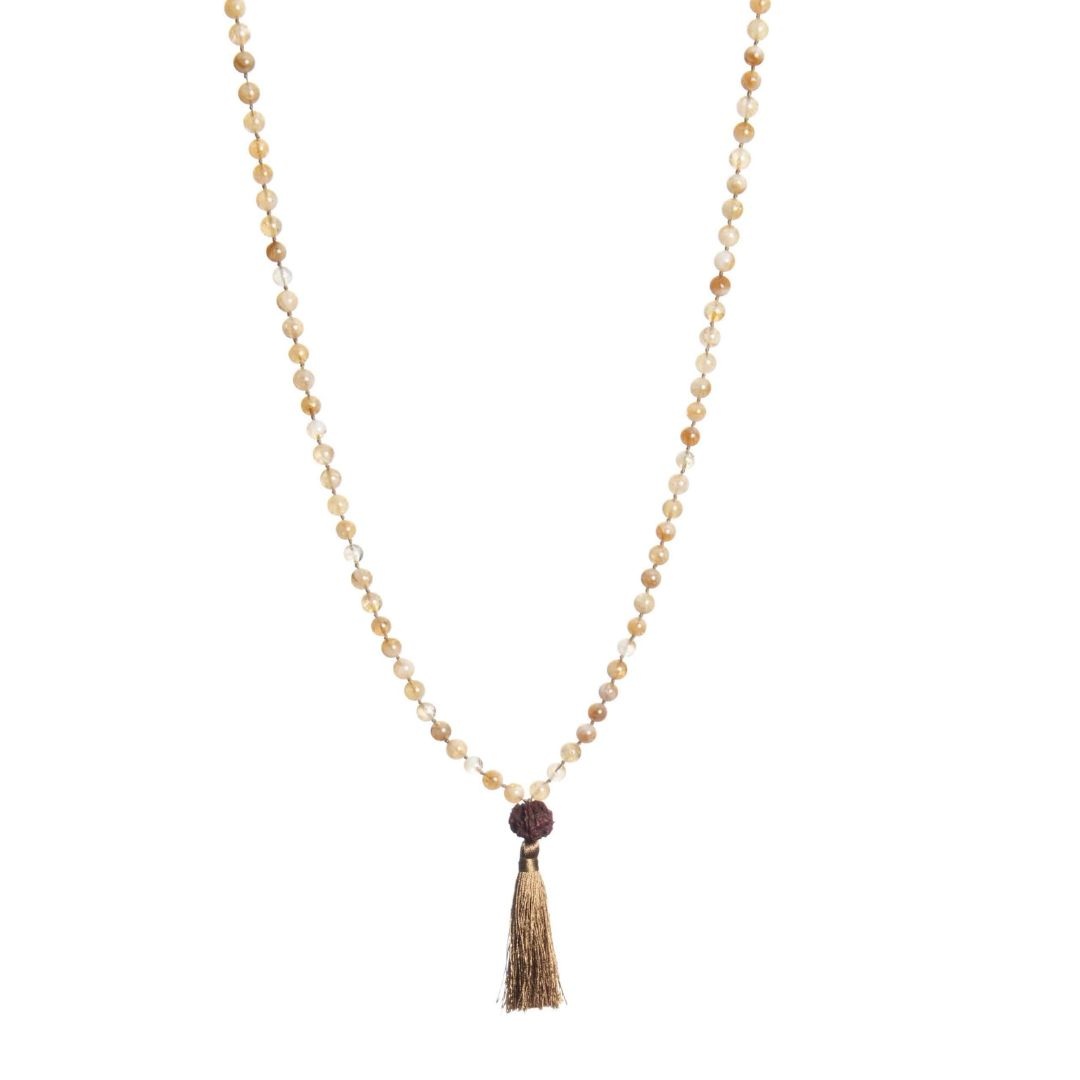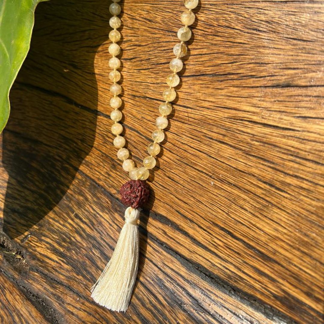 Ilumine sua jornada espiritual com o brilho do Citrino! Este Japamala possui contas de citrino, um meru de semente de Rudraksha e uma franja em tom bege. Uma combinação de positividade e elegância.