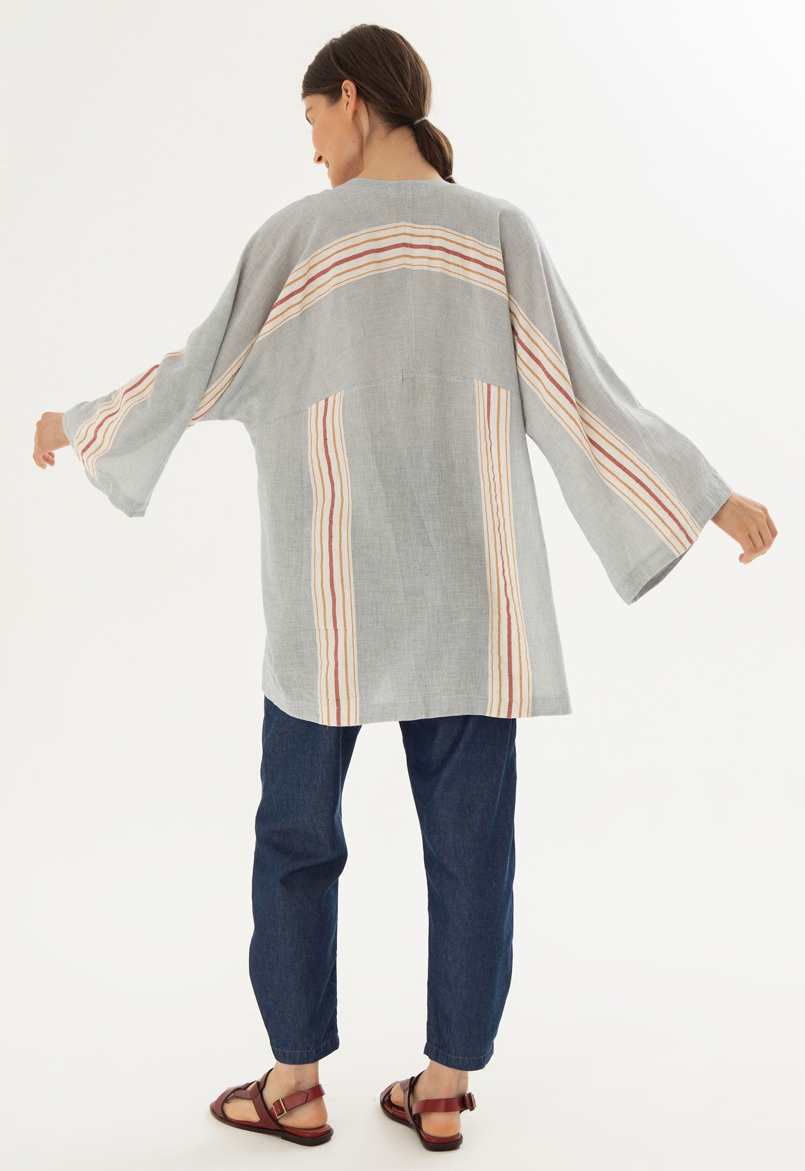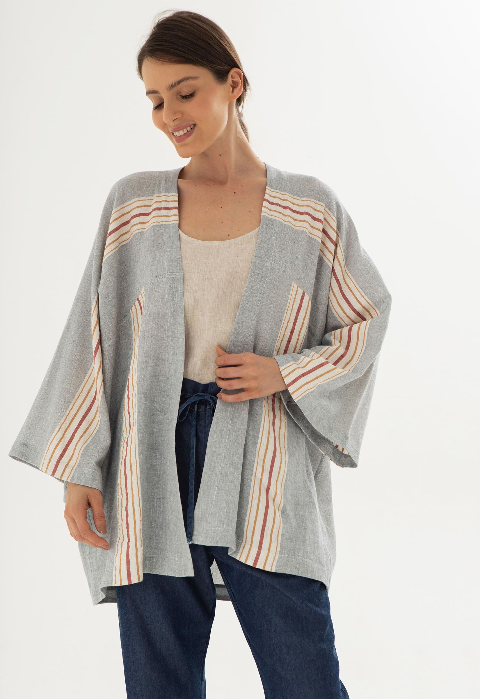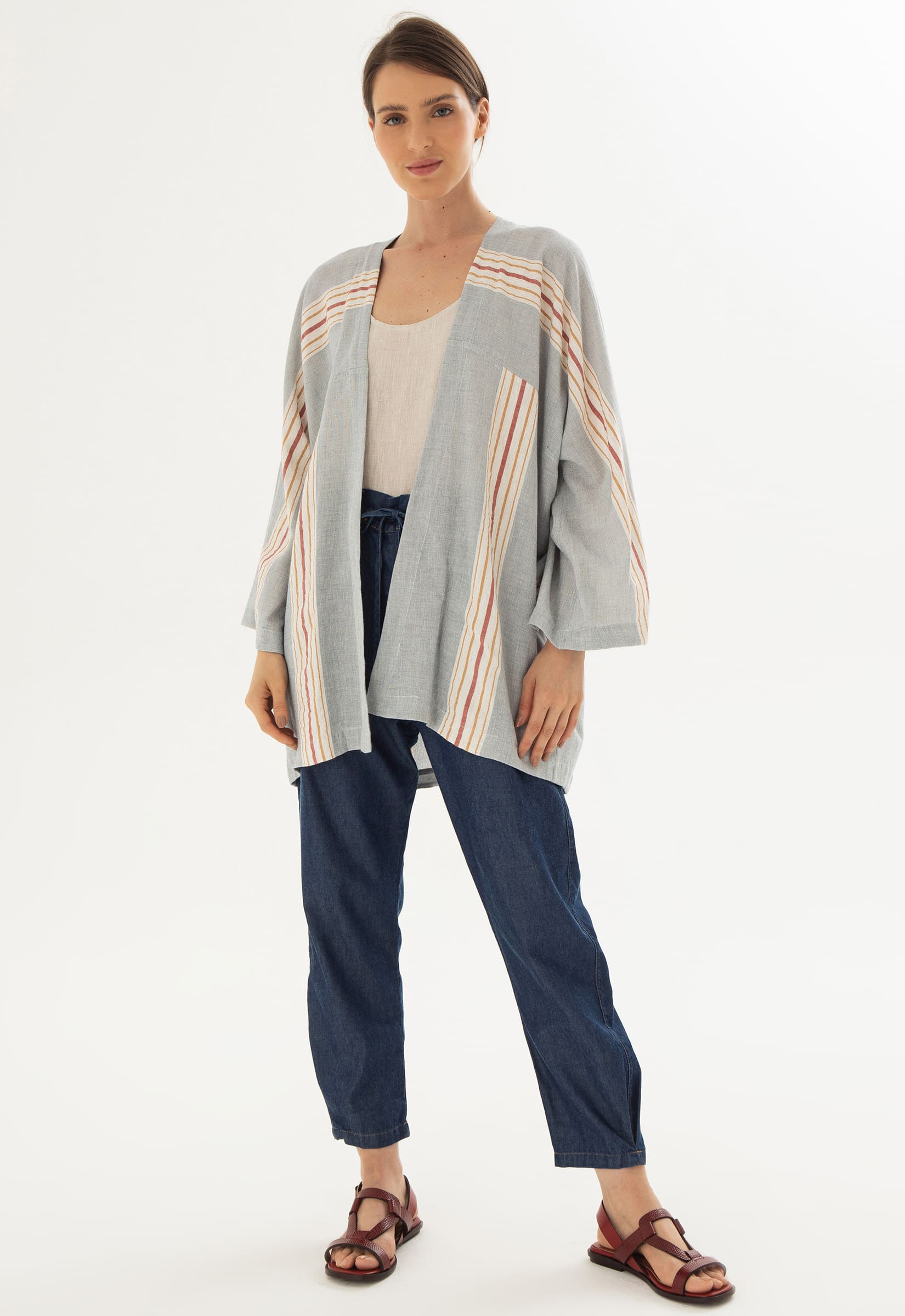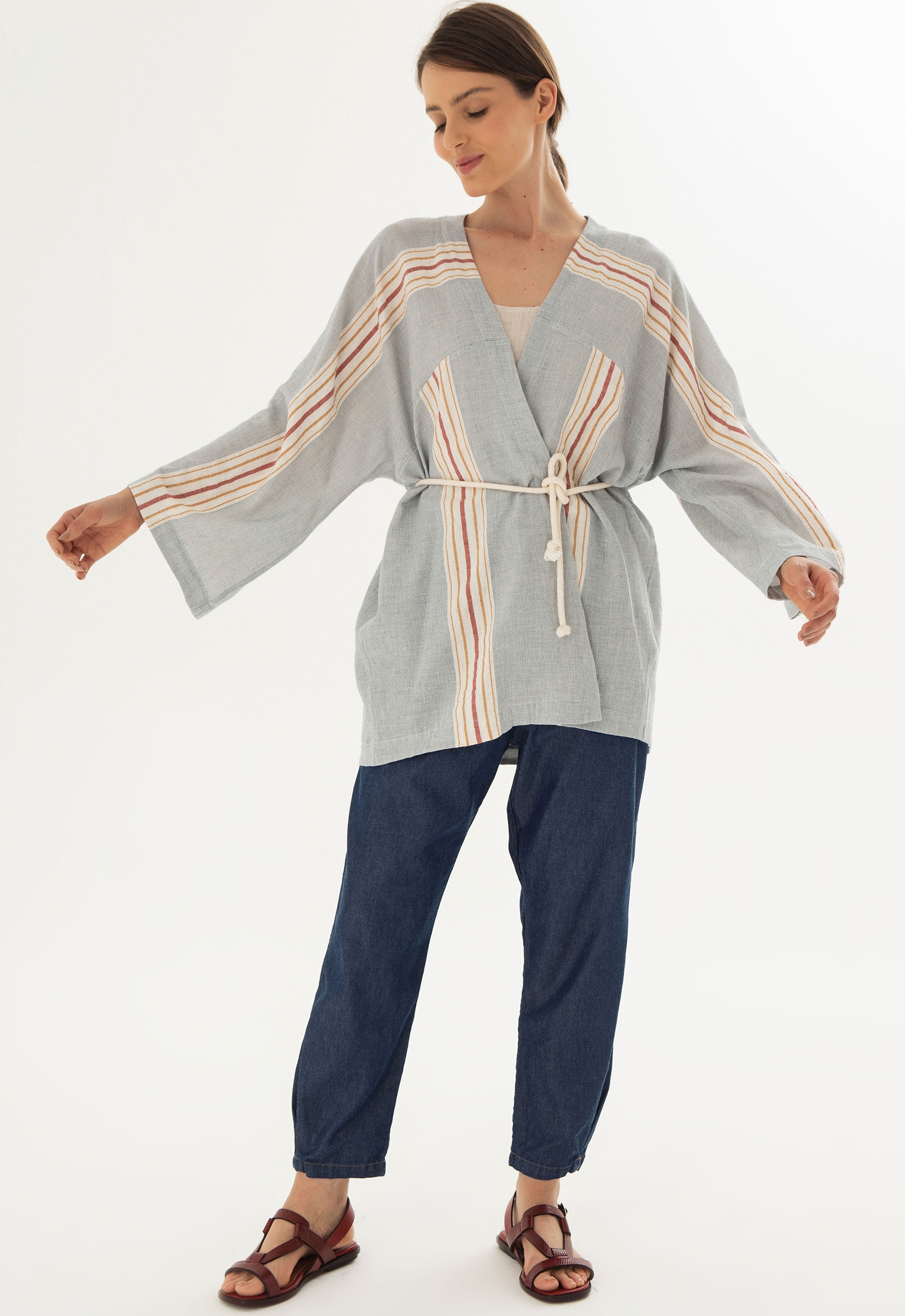 Kimono azul com listras nas cores natural, ocre e carmim. Modelagem ampla, acompanha faixa para amarração na cintura em cordão cru.