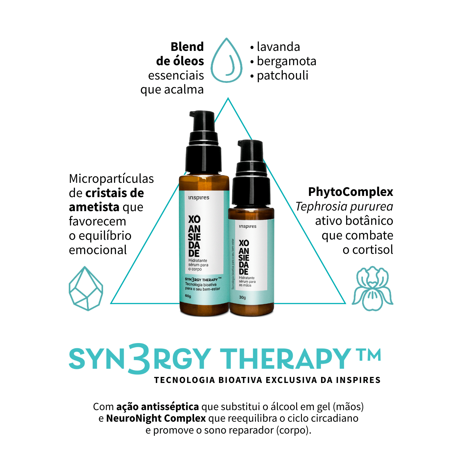 Com a exclusiva tecnologia Syn3ergy Therapy™, os hidratantes combinam blend de óleos essenciais ( lavanda+ bergamota + patchouli), Neuroline® e cristais de ametista para promover alívio da ansiedade, equilíbrio emocional e cuidado completo da pele. Suas fórmulas atuam de forma complementar ao longo do dia e da noite:DURANTE O DIA CALMA E PROTEÇÃO: