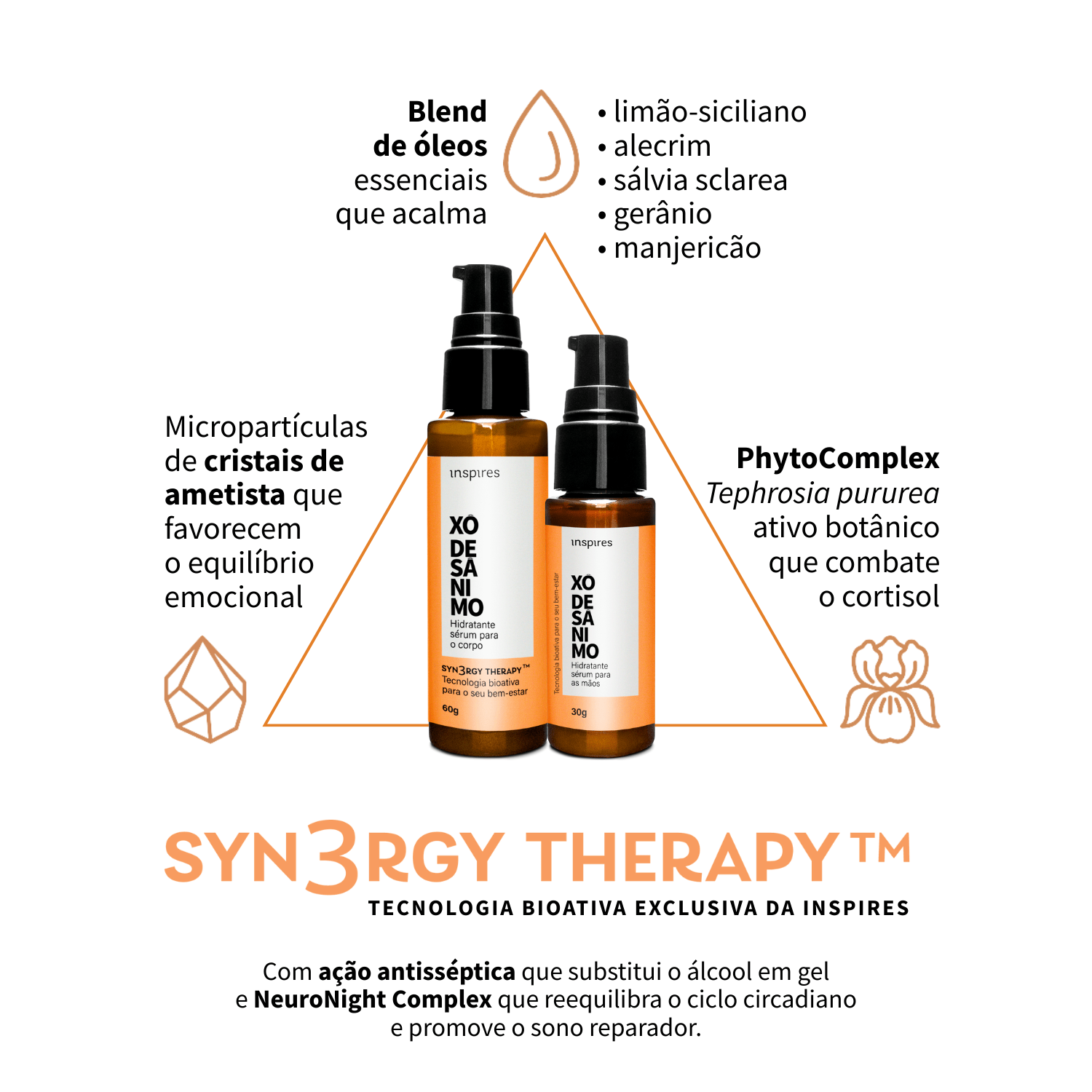 Com a exclusiva tecnologia Syn3ergy Therapy™, os hidratantes combinam blend de óleos essenciais (limão siciliano + alecrim + salvia sclarea + gerânio + manjericão), Neuroline® e cristais de ametista para promover alívio da ansiedade, equilíbrio emocional e cuidado completo da pele. Suas fórmulas atuam de forma complementar ao longo do dia e da noite: