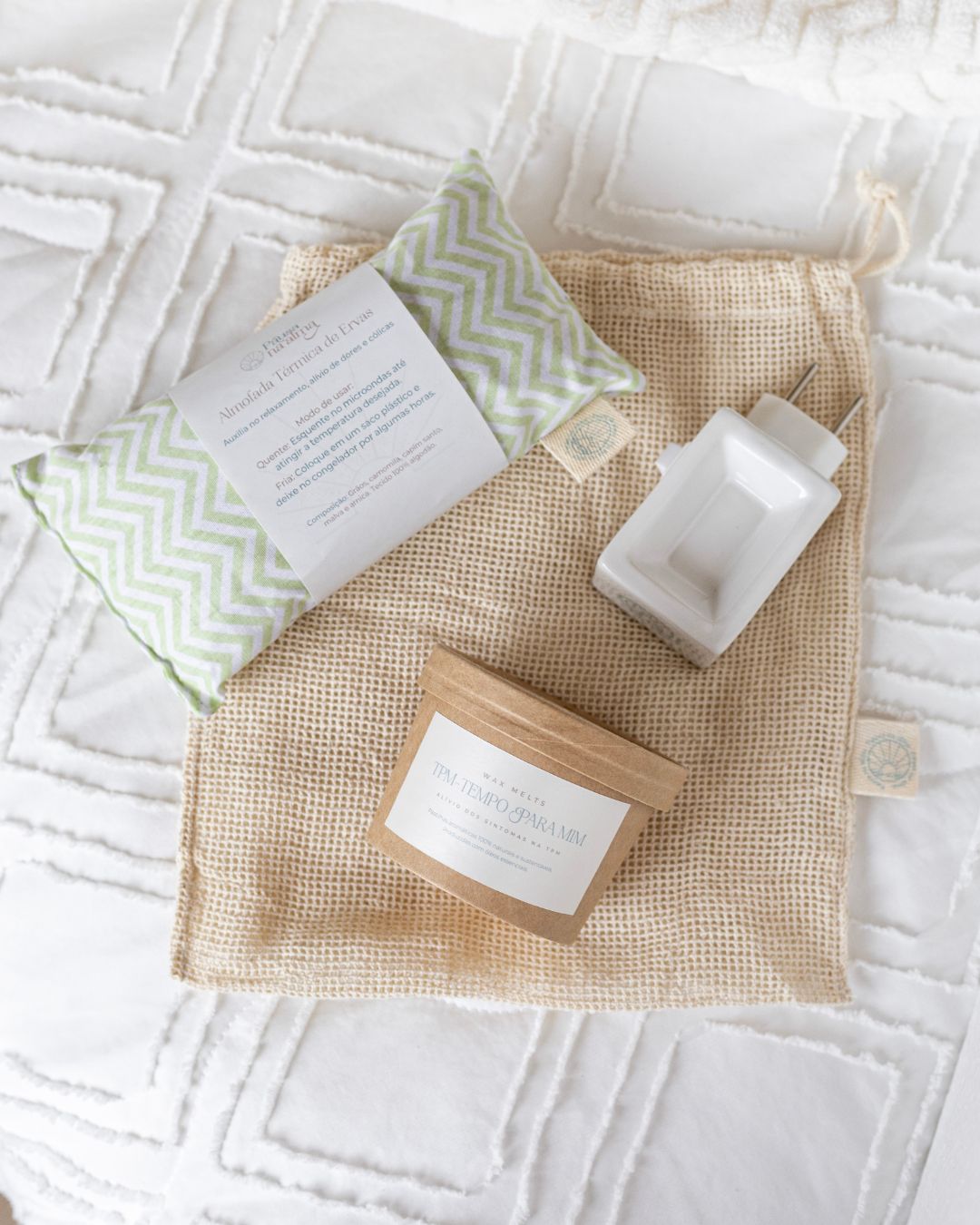 Kit Tempo para Mim O kit tempo para mim contém: 01 almofada térmica de grãos e ervas. 01 melts Tempo Para Mim, elaborado com blend de ceras vegetais, óleos essenciais de sálvia, lavanda e ylang ylang, que auxiliam nos sintomas emocionais típicos da TPM e menopausa, como irritabilidade e desânimo. Vem com 07 unidades. 01 difusor de porcelana, de tomada, bivolt. Acompanha embalagem de algodão cru, modelo saquinho.