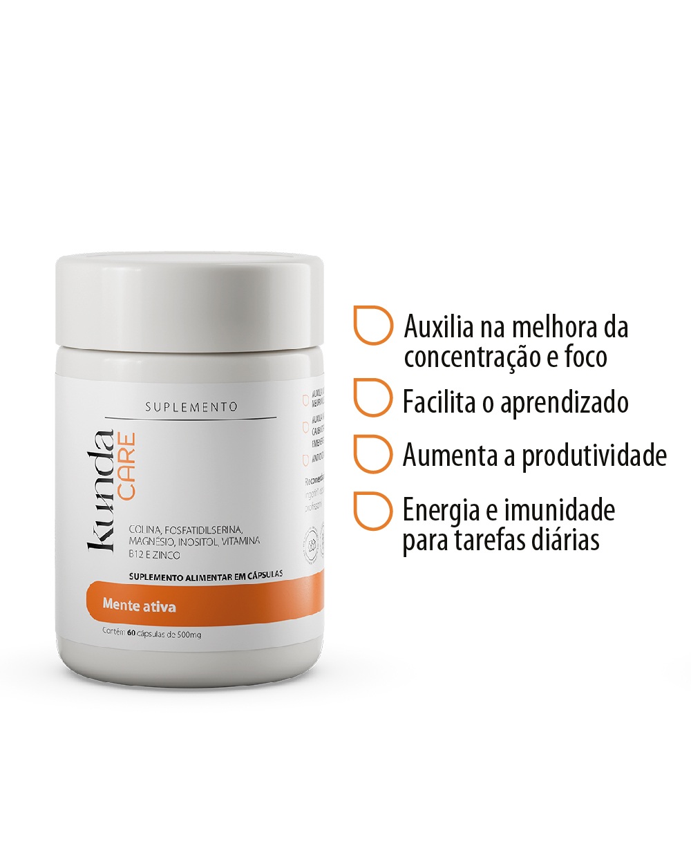 O SUPLEMENTO MENTE ATIVA KUNDA CARE possui formulação exclusiva com 6 nutrientes específicos que nutrem e estimulam neurotransmissores: vitamina B12, zinco, magnésio, inositol, colina e fosfatildiserina.