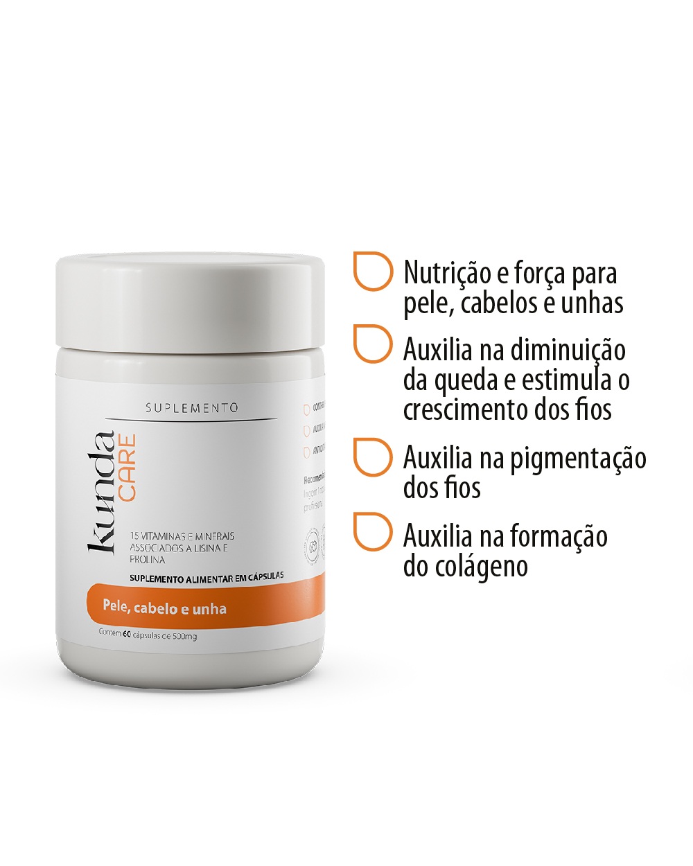 O SUPLEMENTO PELE, CABELO E UNHA KUNDA CARE foi desenvolvido especialmente para auxiliar a nutrir a pele, os cabelos e as unhas das mulheres 40+ de dentro para fora. Sua formulação exclusiva conta com 17 nutrientes: vitamina A, vitaminas do Complexo B, vitamina C, vitamina E, Biotina, Zinco quelato, Cobre quelato, Ferro quelato, Selênio quelato e três aminoácidos essenciais como L-lisina, L-prolina. Recomendamos a ingestão de 1 cápsula em qualquer horário do dia.