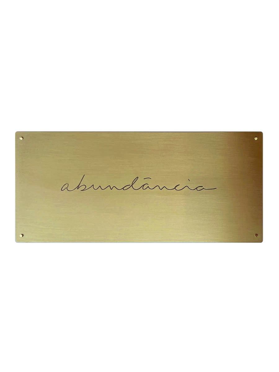 Placa em latão escovado com a gravação: “abundância”.