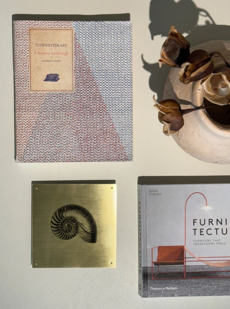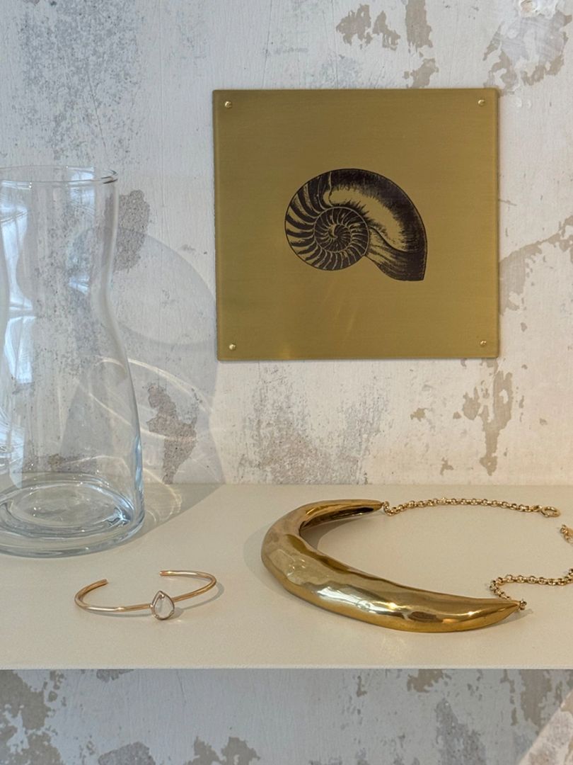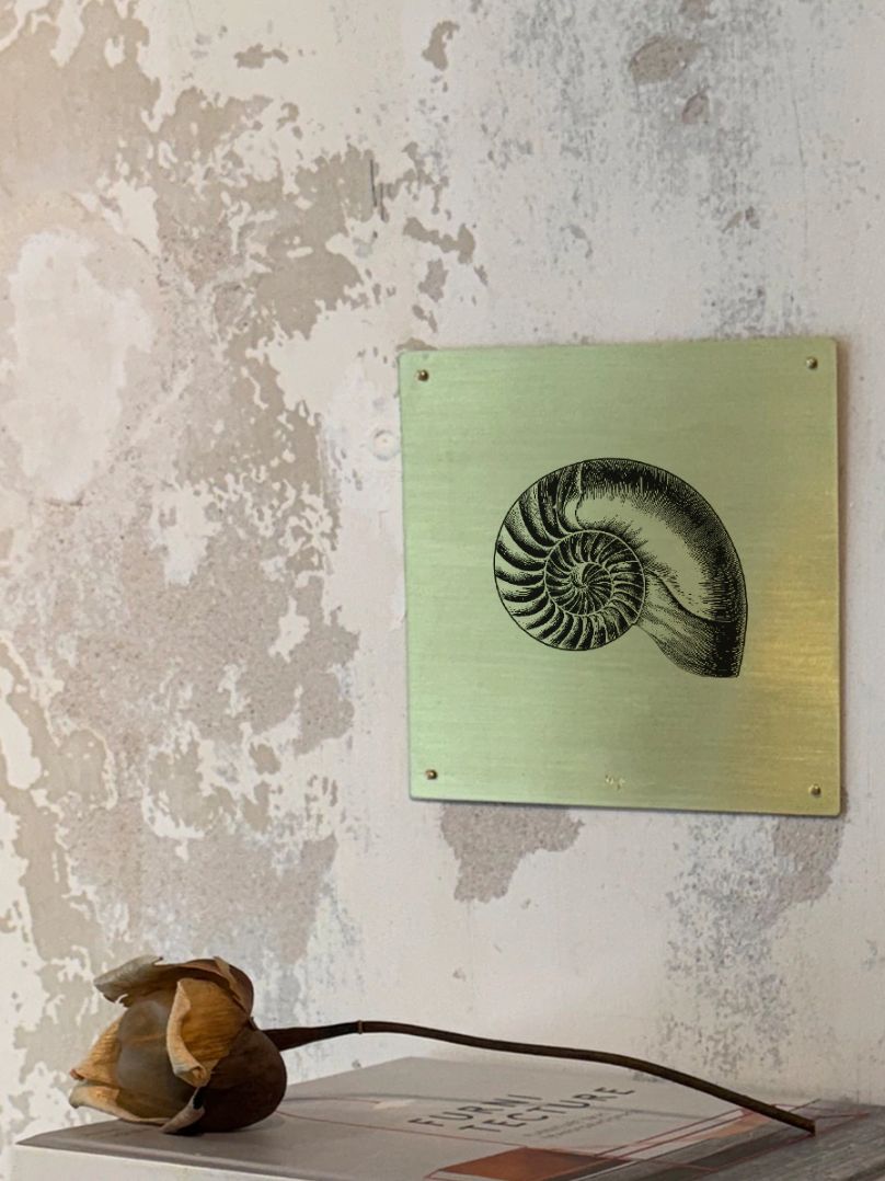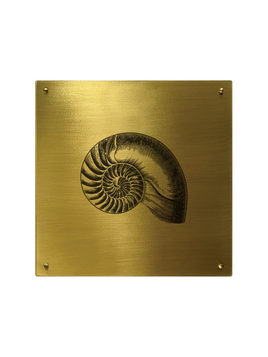 Placa em latão escovado com a ilustração de uma concha Nautilus.