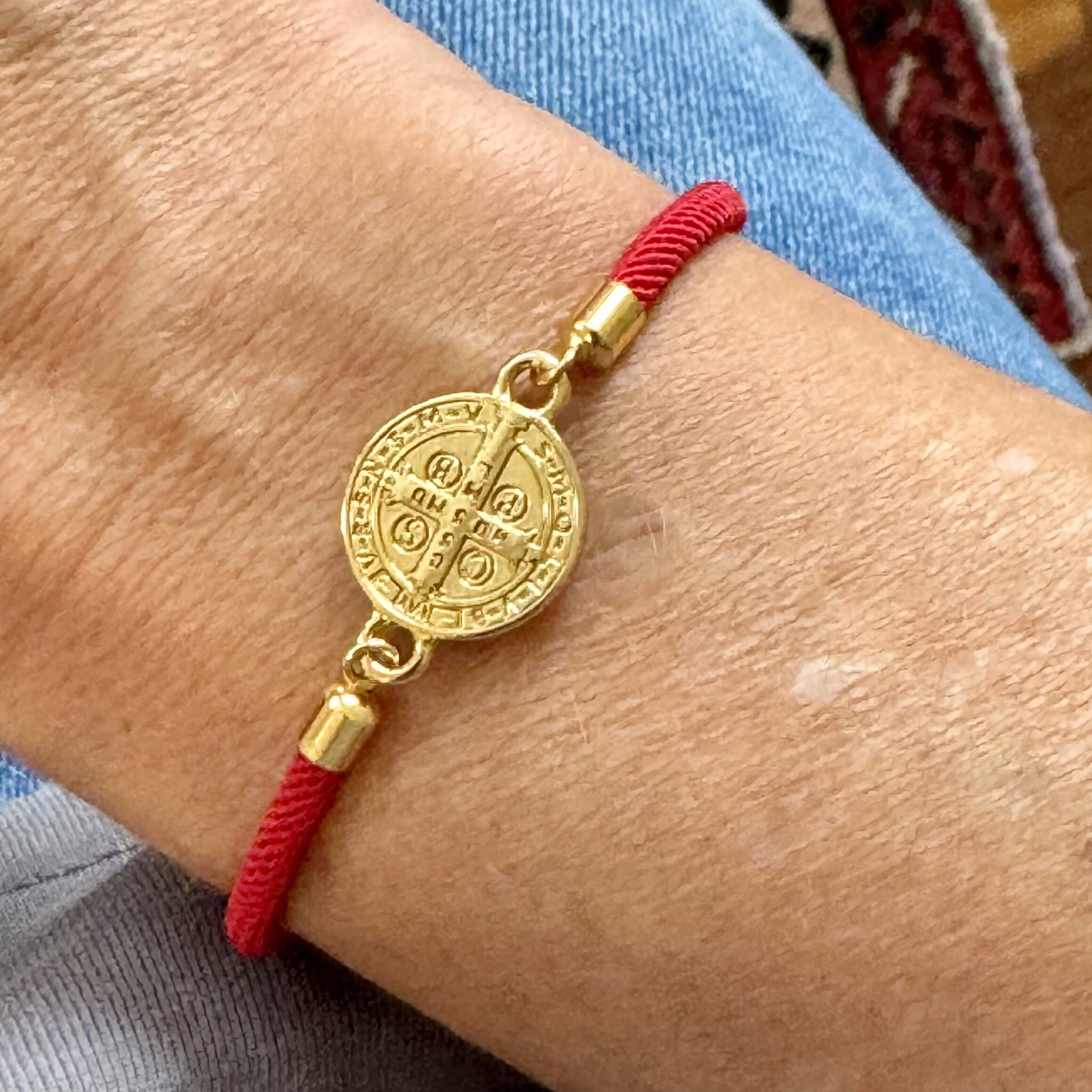 Descubra a força e a proteção que a nossa pulseira de proteção com a medalha da Cruz Sagrada de São Bento pode oferecer. Este acessório único não é apenas uma peça de moda, mas também um símbolo poderoso de fé e segurança. Pulseira confeccionada em corda de tecido na cor vermelha, com a medalha da Cruz Sagrada de São Bento no banho dourado. Material da medalha zamac.