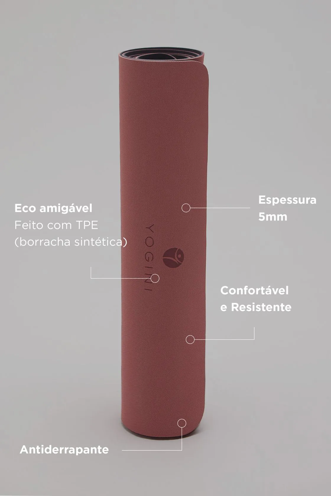Eco amigável – Feito com TPE (elastômero termoplástico) que é uma borracha sintética. Reciclável. Reutilável. 100% livre de PVC. Não tóxico. Não usa metais pesados. Antimicrobiano. À prova dágua. Não usar escova, pode danificar o seu tapete. Não deixe seu mat exposto ao sol ou altas temperaturas. Secar o seu tapete após a prática.