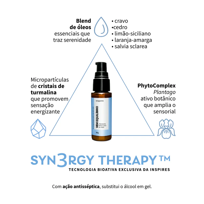 Tecnologia Syn3rgy Therapy™ com blend de óleos essenciais (cravo + sálvia + limão siciliano + cedro + petitgrain), Neuroline® e cristais de ametista.